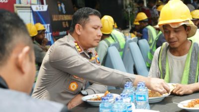Kota Malang | radarjatim.co.~Terlihat pemandangan berbeda di Polresta Malang Kota. Di sela kesibukannya, Kapolresta Malang Kota Kombes Pol. Budi Hermanto tampak makan siang bersama pekerja proyek bangunan dan petugas cleaning service Polresta Malang Kota di halaman depan Mapolresta.