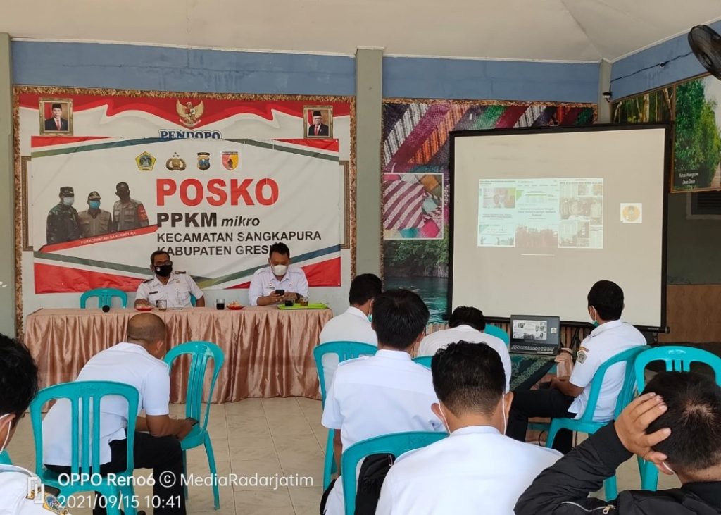 Camat Sangkapura, M. Syamsul Arifin, S. Sos, MM, didampingi oleh Sekcam Sangkapura, Yuson Lawu Malvi S, STP, MM, memimpin Zoom Meeting dengan Reno Sundara ( CEO ) Simpel Desa yang dilaksanakan di Pendopo Kecamatan Sangkapura dengan dihadiri oleh semua Sekdes dari 17 Desa yang berada di Kecamatan Sangkapura, (15/9).