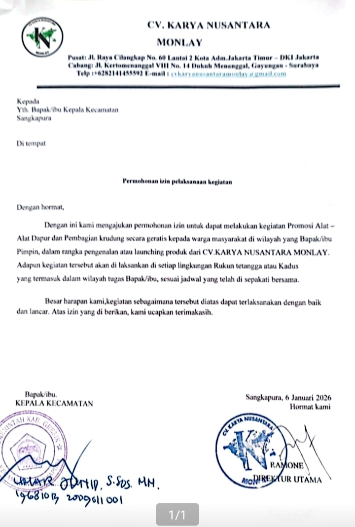 Ironisnya dalam melakukan aksinya oknum sales dari CV. KNM mendatangi kantor kecamatan Tambak dan Sangkapura tanpa legalitas dokumen usaha seperti NIB, SIUP, NPWP, dan akta pendirian Perusahaan untuk minta persetujuan agar dapat menjual selang elpiji dengan modus menawarkan promosi alat-alat dapur dan memberikan bonus kerudung gratis untuk menarik minat masyarakat agar datang berbondong-bondong berkumpul di rumah kasun atau musholla (6/1/2026).