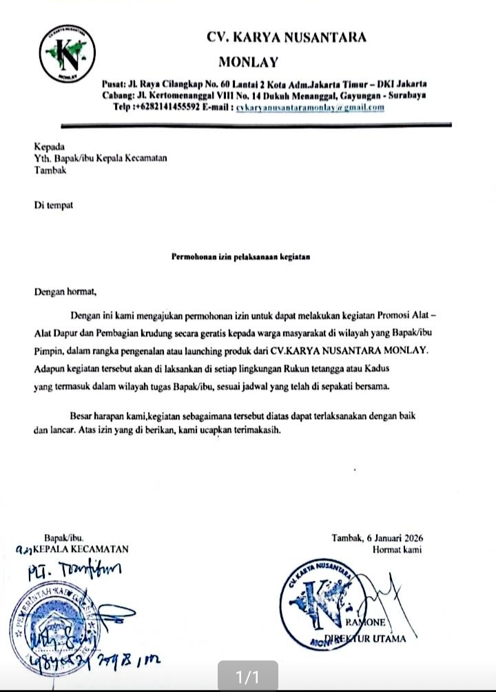 Keterangan Foto; Surat permohonan ijin pelaksanaan kegiatan dari CV Karya Nusantara Monlay yang ditandatangani Plt Trantib dan stempel kantor Kecamatan Tambak
