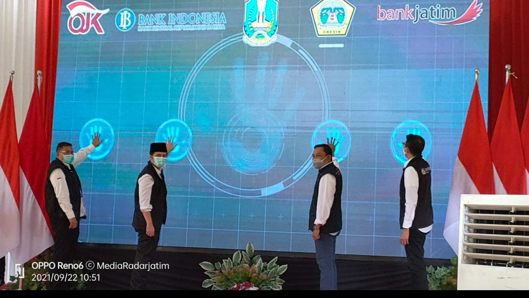 Launching QRIS ditandai dengan Tekan Tombol On dilayar Proyektor oleh Wakil Gubernur Pemprov Jatim, Kepala Otoritas Jasa Keuangan, Deputi Kepala Perwakilan Bank Indonesia serta Direktur Utama Bank Jatim, Busrul Iman, Rabu ( 22/9/2021 )