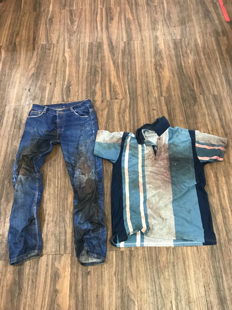 Barang bukti yang ikut diamankan, 1 besi pleser, 1 helai rambut korban, celana jeans warna biru milik pelaku yang ada noda darahnya dan kaos berkrah bermotif warna biru tua, putih dan biru muda. (Fir)