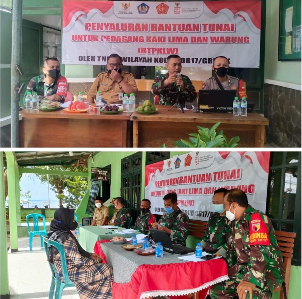 Penyaluran bantuan ini dilaksanakan selama 2 hari di Makoramil 0817/17 Sangkapura dan Makoramil 0817/18 Tambak, Penyaluran Bantuan Tunai Untuk Pedagang Kaki Lima dan Warung ( BTPKLW ) sebanyak 163 orang dipantau langsung oleh Kapten Infanteri Siari atas Intruksi Dandim 0817/ Gresik Letkol Infanteri Taufik Ismail,S. Sos, M.I, Pol, dimulai Hari Senin sampai Selasa di pagi hari dengan di bantu 2 orang sebagai pendataan, diantaranya: Peltu Mahfud dan Sersan Satu Wahyu Hidayat.