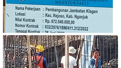 Nganjuk | Radarjatim.co-Pembangunan jembatan di desa Klagen kecamatan rejoso yang tahap pembangunan bersumber dana dari APBD dan menghabiskan dana sebesar 672.540.000,-terkesan Asal jadi.