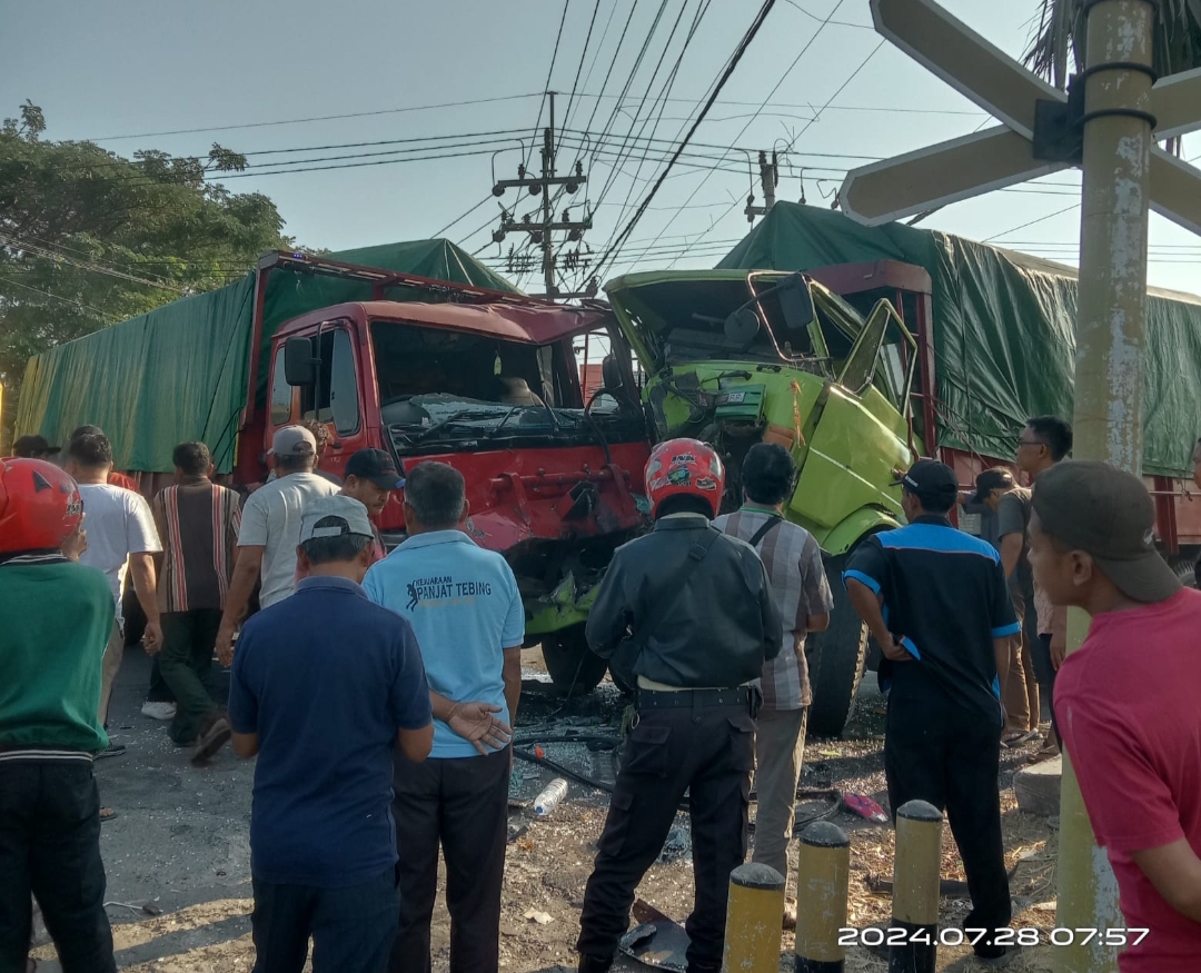 Kedua kabin truk yang mengalami kecelakaan rusak berat karena kerasnya benturan.
