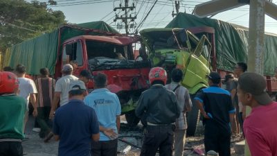 Kedua kabin truk yang mengalami kecelakaan rusak berat karena kerasnya benturan.