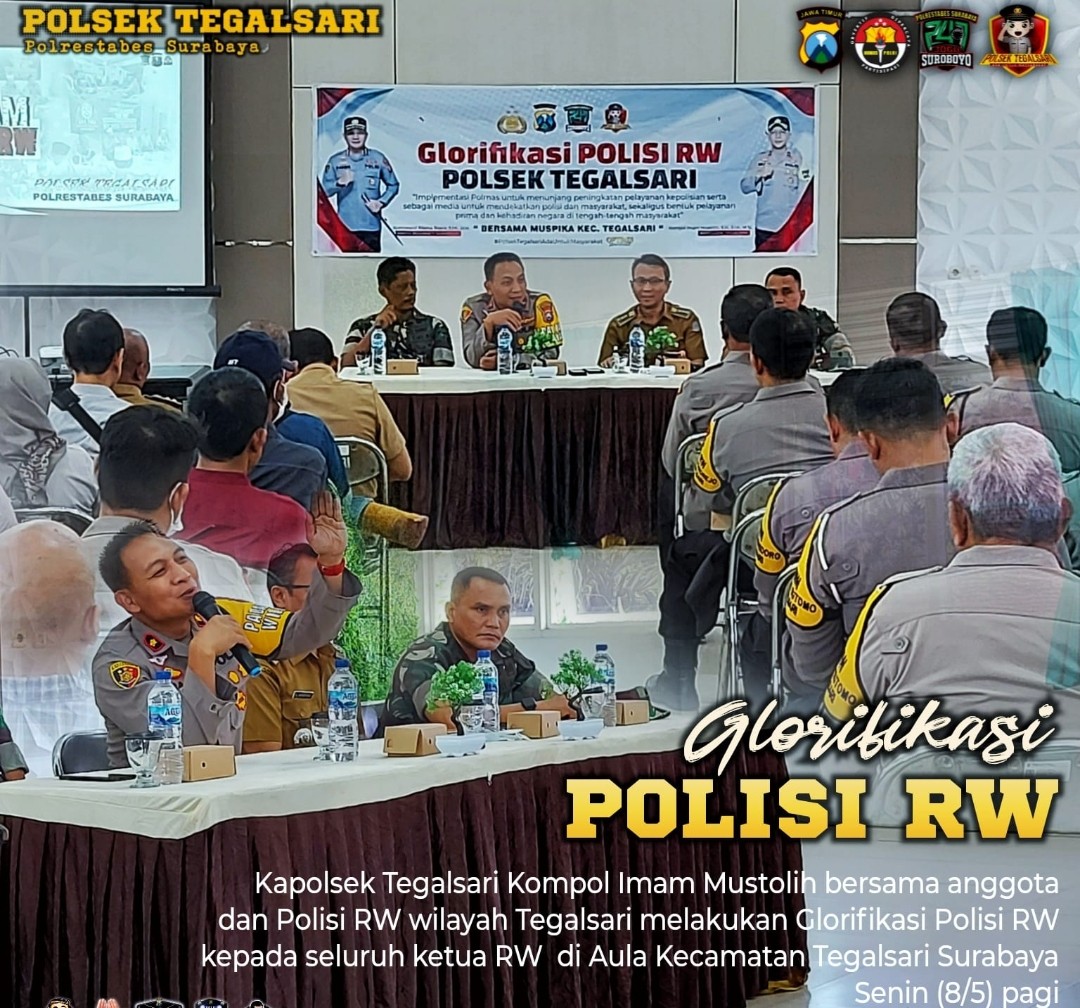 Surabaya || radarjatim.co ~Dalam rangka menunjang Program Kerja Prioritas Kapolri dibidang Harkamtibmas,Kapolsek Tegalsari Kompol Imam Mustolih bersama Camat dan Danramil Tegalsari, telah dilaksanakan Glorifikasi Polisi RW pada seluruh ketua RW se kecamatan Tegalsari. Dalam giat tersebut dilakukan dialog dan penyampaian pesan Kamtibmas bertempat di aula Kantor Kecamatan Tegalsari. Surabaya Senin, (08 /5/2023 )sekira pukul 09.00 Wib.