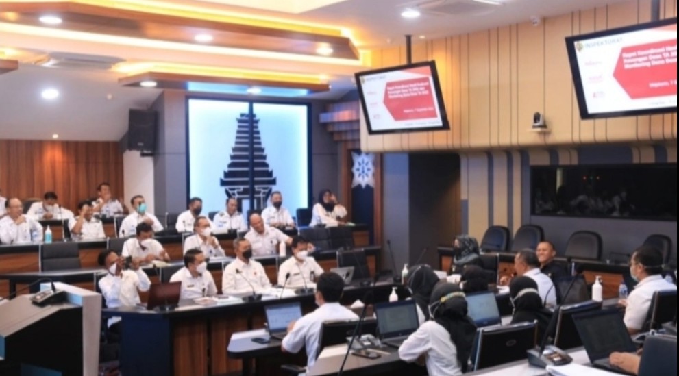 Mojokerto | radarjatim.co- Bupati Mojokerto Ikfina Fahmawati didampingi oleh Sekretaris Pemerintah Daerah Kabupaten Mojokerto Teguh Gunarko menghadiri Rapat Koordinasi (Rakor) hasil evaluasi keuangan desa tahun anggaran 2021 dan monitoring dana desa tahun anggaran 2022, yang diselenggarakan oleh Inspektorat Kabupaten Mojokerto.