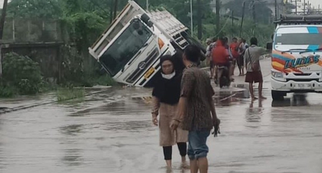 Akibat jalan yang tergenang banjir, kendaraan yang melintas di wilayah itu pun celaka. Sebuah truk terperosok ke selokan karena tertutup banjir.
