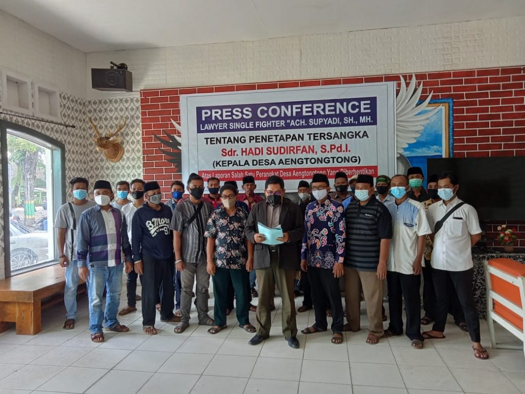 Bertempat di salah satu Cafe & Resto yang terletak di jantung Kota Sumenep, 8 perangkat desa yang di berhentikan tersebut ditemani Lawyer Single Fighter Ach Supyadi SH MH mengadakan Press Conference tentang penetapan Kades Aengtongtong sebagai tersangka. Rabu 03/01/2021.