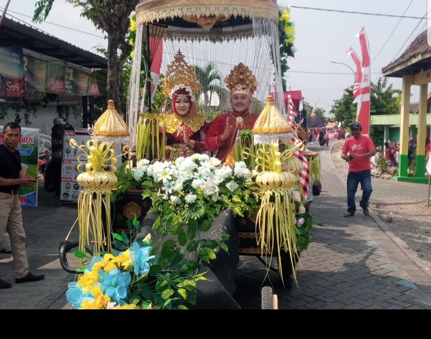 Kades Dodik Setiawan. SE, dan istri berpakaian Raja dan Ratu Udayana Bali dan dibelakangnya terlihat jajaran perangkat desa menggunakan kostum adat Bali.