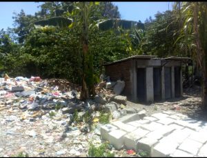 Sampah menumpuk dan bercampur material bangunan di Sampingnya ada Sanitasi dan MCK yang tidak layak digunakan. Lokasi ini di Jalan Usman Sadar Gang 20 Kampung Pojok, Kelurahan Karang Turi Gresik.