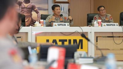 Memastikan kesiapan pertunjukan kolosal Gebyar Malam Puncak Nusantara Gemilang Jatim 2022 pada H-3 ,Kapolda Jawa Timur Irjen Pol Nico Afinta bersama Waka Polda Jatim Brigjen Pol Slamet Hadi Supraptoyo dan beberapa Pejabat Utama Polda Jatim menggelar rapat koordinasi ( rakor….red) bersama panitia pelaksana di Rupatama Semeru Polda Jatim,Jumat (12/8/22)