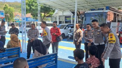 Terlihat Kapolres Gresik menyapa ramah ke pemohon SIM yang akan menjalani ujian teori maupun praktek di Satpas Polres Gresik