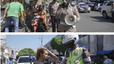 Penindakan dipimpin langsung Kanit Kamsel Iptu Sri Maryani dan personel Satlantas Polres Gresik. Sambil membawa pengeras suara memberikan himbauan kepada warga di kawasan Pasar Gresik, Rabu (25-02-2022).