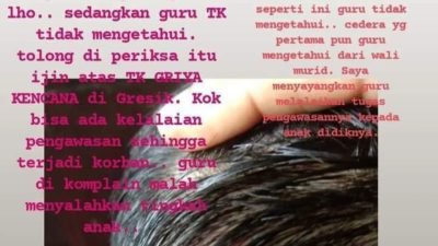 “Tolong diperhatikan kualitas guru dan sekolah TK yang ada di gresik khususnya di driyorejo di TK Griya Kencana, kronologi awal anak saya pulang dengan keadaan benjol kepala, sudah 2x. kejadian pertama, anak saya tidak sengaja tertabrak ayunan dan membuat kepala anak saya benjol.” Tulisnya dalam aduan.
