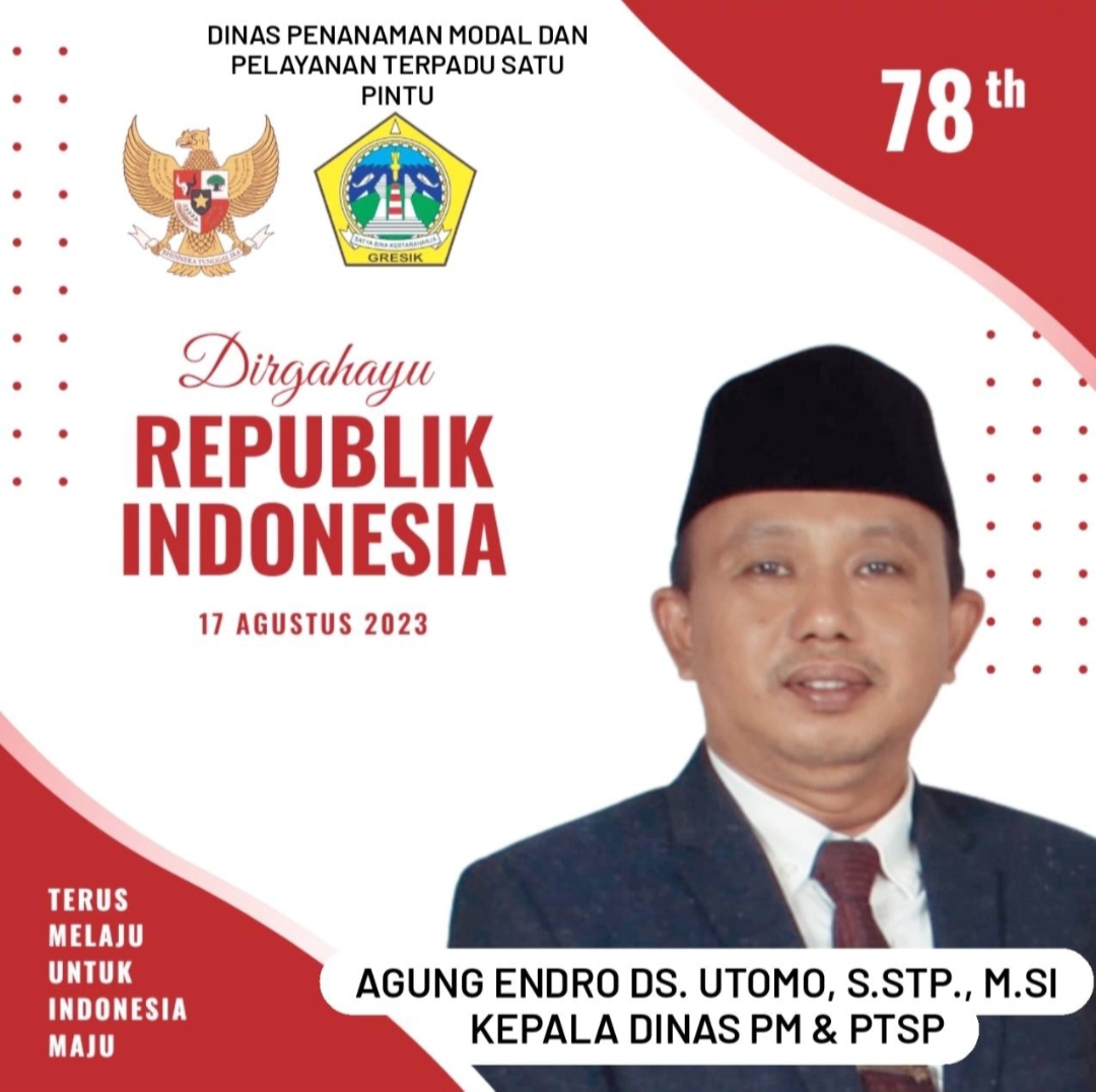 Maka dalam rangka menyambut HUT kemerdekaan RI ke 78 tahun pada 17 Agustus 2023, Kepala Dinas Penanaman modal dan pelayanan terpadu satu pintu (PM & PTSP) Kabupaten Gresik Provinsi Jawa Timur, AGUNG ENDRO DS. UTOMO, S.STP., M.Si beserta segenap pegawai mengucapkan ” Selamat HUT kemerdekaan Rl ke 78 Tahun”