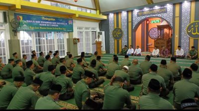 Gresik | RADARJATIM.CO.~Suasana khusyu’ dan penuh berkah di Masjid Baiturrahman Kodim 0817/Gresik dengan adanya acara Peringatan Maulid Nabi Muhammad SAW 1445 H/ 2023 M. Acara dilaksanakan secara terpimpin oleh Kapten Inf Siari (Pjs. Kasdim 0817/Gresik), dengan diikuti oleh seluruh Perwira Staf Kodim, Para Danramil Jajaran, Bintara Tamtama dan ASN Kodim 0817/Gresik. Senin (2/10/2023).
