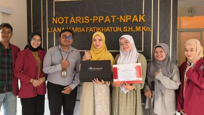 Kelompok Magang Mandiri yang di ikuti oleh lima Mahasiswa yaitu, Nur Azizah, Alisa Dewanti, Reza Binadzary Fitri, Bintang Oria Ritonga dan Aqshal Aldito Putra Aristya.dalam pelaksanaan Magang Mandiri kali ini mahasiswa turut andil dalam merangkai kepastian hukum atas tanah dan kewajiban lainnya di kantor Notaris Liana Maria Fatikhatun, S.H., M.Kn. yang bertempat di Perum Royal Orchid Blok A3, Sengkaling, Mulyoagung, Kecamatan Dau Kabupaten Malang pada Selasa, 5 Maret 2024. Kegiatan tersebut merupakan salah satu dari serangkaian magang kegiatan dari Kantor Notaris dan PPAT Liana Maria Fatikhatun S.H., M.Kn. yang diikuti oleh mahasiswa magang Fakultas Hukum UMM.