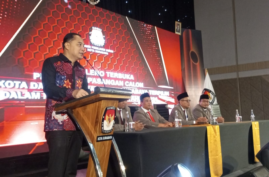 Dalam sambutannya ketua KPU Surabaya Soeprayitno menyampaikan rasa syukur telah menyelesaikan tahapan akhir pilkada Surabaya tahun 2024 telah berjalan dengan lancar dan ditetapkan Eric Cahyadi sebagai walikota Surabaya dan Ir.Armuji sebagai wakil walikota Surabaya.
