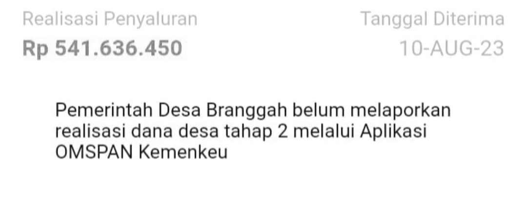 Pada Tahap 2 tahun 2023 Desa Branggah menerima transfer DD sebesar Rp. 541.636.450 namun tercatat belum melampirkan realisasi penggunaan pada laman OMSPAN, begitupun di tahap 3 Desa ini hanya melaporkan realisasi BLT Dana Desa sebesar Rp. 122.400.000.