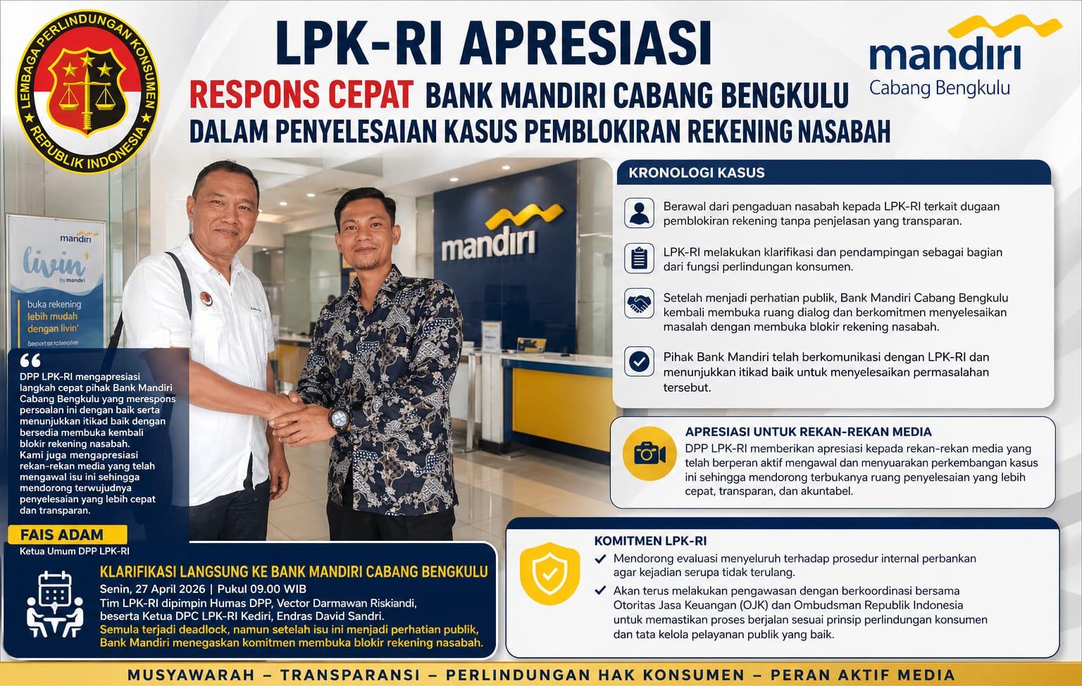 Sebelumnya, tim LPK-RI yang dipimpin Humas DPP, Vector Darmawan Riskiandi, bersama Ketua DPC LPK-RI Kediri, Endras David Sandri, telah melakukan klarifikasi langsung ke Kantor Cabang Bank Mandiri S. Parman, Bengkulu pada Senin (27/4/2026) pukul 09.00 WIB.