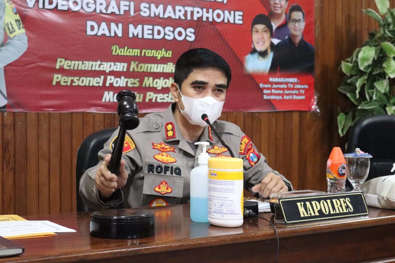 Kapolresta Mojokerto AKBP Rofiq Ripto Himawan, S.I.K., S.H., M.H. menghadirkan Erwin Saputra jurnalis TV Jakarta, Azril mantan Jurnalis Stasiun TV SCTV sekaligus Dosen President University dan Politeknik Negeri Media Kreatif Jakarta, dan Sri Rama Ardi Putra dari Jurnalis TV Surabaya.
