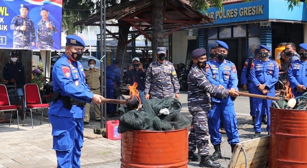 GRESIK | RADARJATIM.CO– Momen hari ulang tahun ke-71 Airud, Kapolres Gresik membakar jaring trawl. Sebanyak sembilan jaring trawl dibakar sebagai bentuk tegas kepada pihak yang merusak lingkungan.