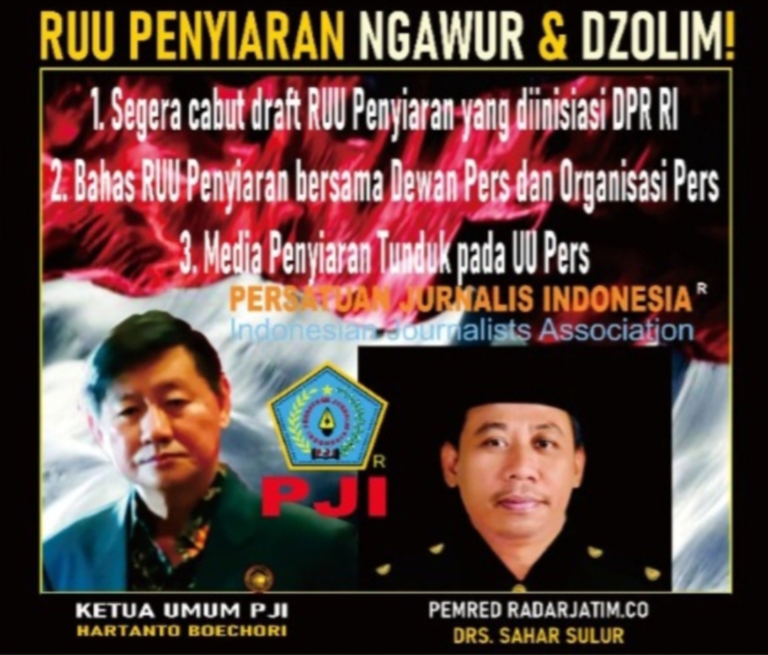 RADARJATIM.CO. ~ PJI (Persatuan Jurnalis Indonesia) setuju UU Penyiaran No. 32 tahun 2002 direvisi. Bahkan memang seharusnya direvisi!, karena media penyiaran tunduk UU Pers dan mematuhi KEJ (Kode Etik Jurnalistik)