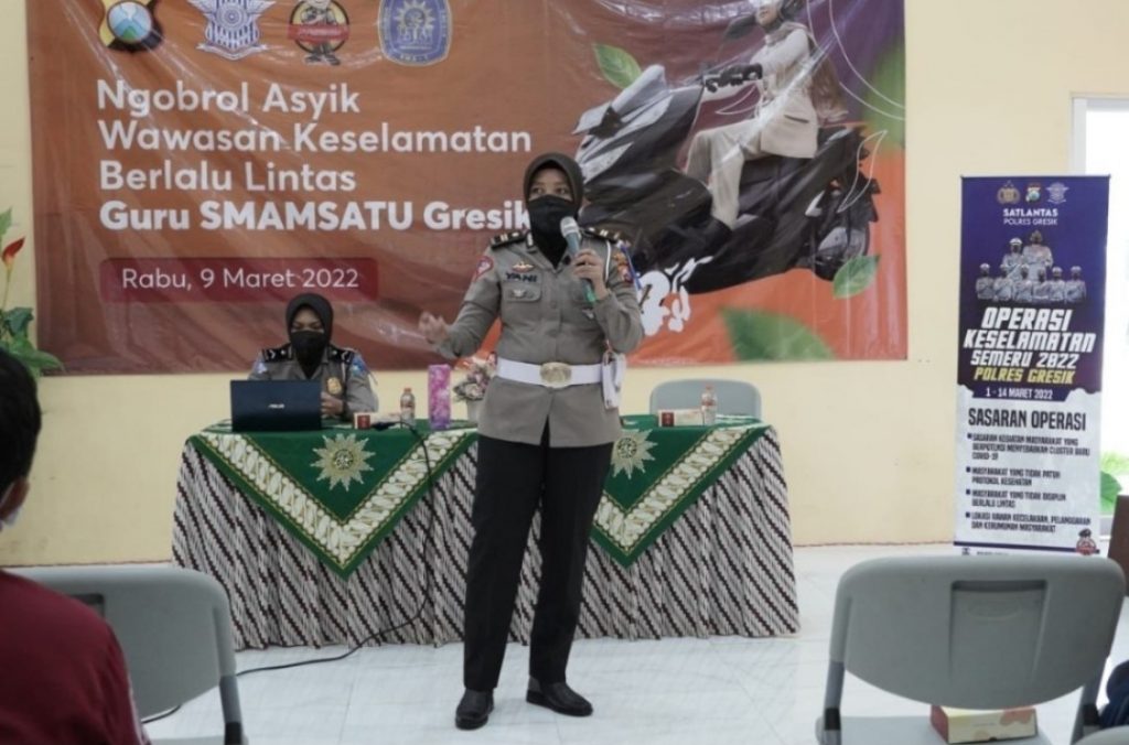 Kanit Dikyasa Satlantas Polres Gresik Iptu Sri Maryani memberikan langsung materi etika lalu lintas kepada guru.