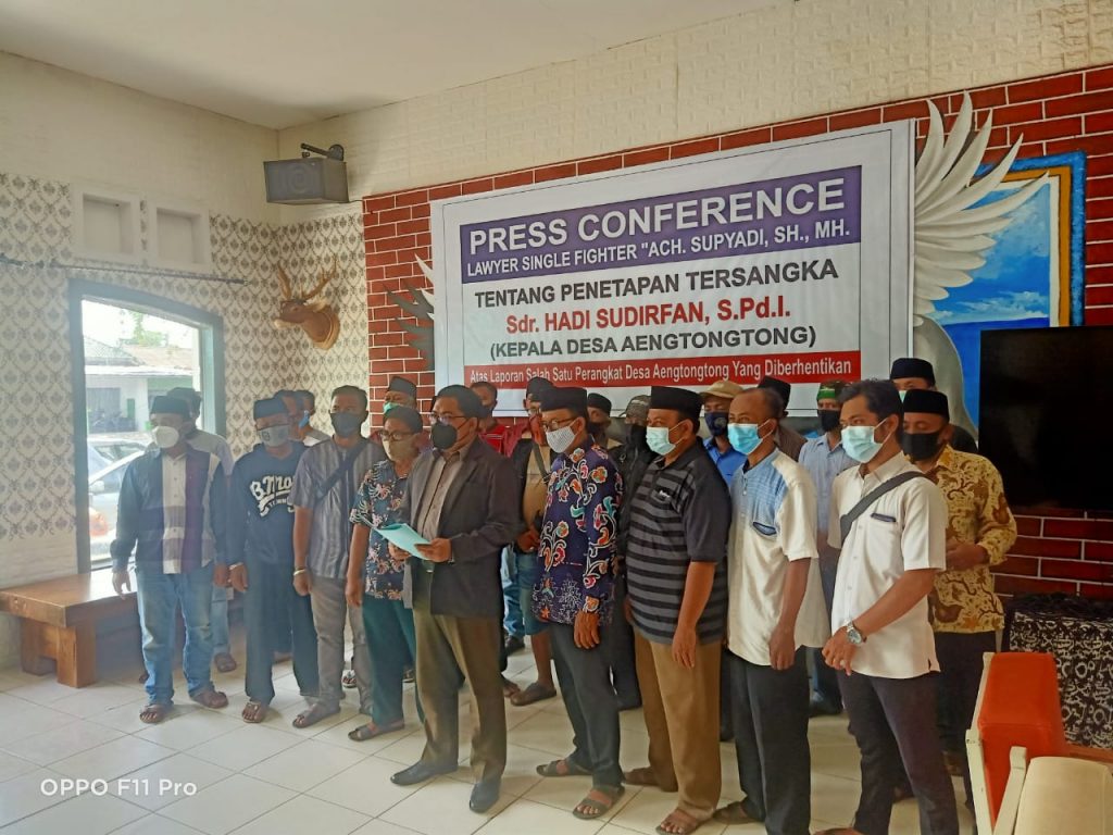 Bertempat di salah satu Cafe & Resto yang terletak di jantung Kota Sumenep, 8 perangkat desa yang di berhentikan tersebut ditemani Lawyer Single Fighter mengadakan Konferensi tentang penetapan status Kades Aeng Tong Tong sebagai tersangka. Rabu 03/01/2021.