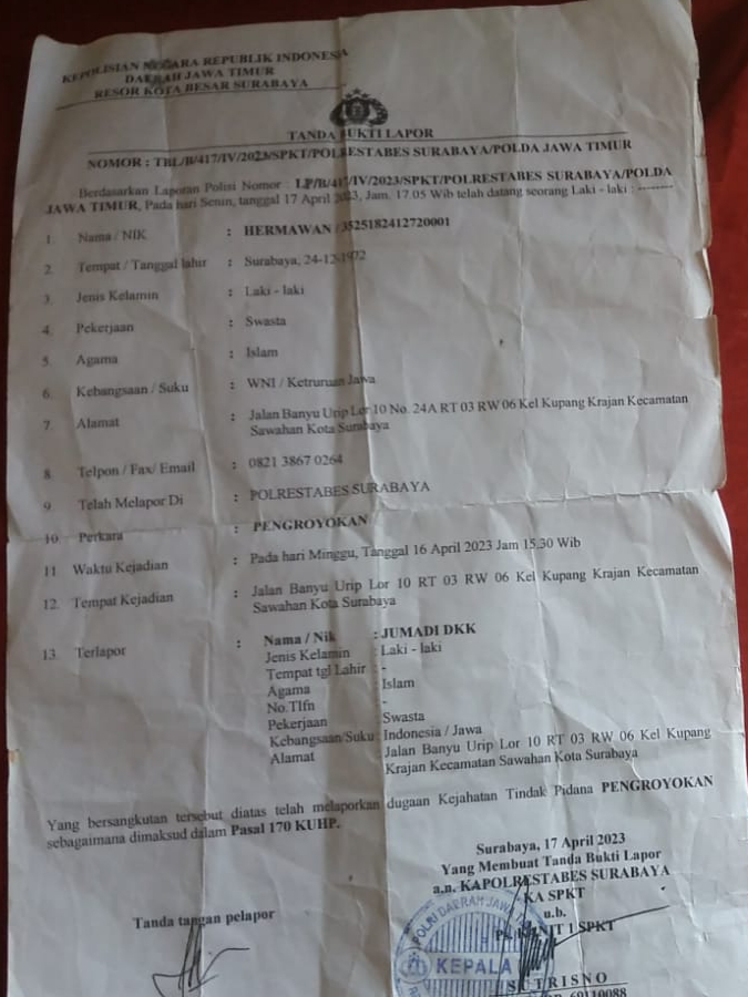 Tak berselang lama HR yang semula dipersilahkan duduk tiba-tiba di keroyok oleh MJ dan 2 orang temannya yaitu ER dan HD. Peristiwa ini pun dilaporkan ke Polrestabes Surabaya pada hari berikutnya Senin 17 April 2023 jam 17.05 WIB.