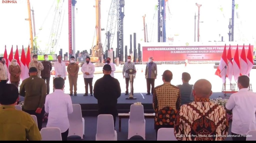 Gresik |www.radarjatim.co- Presiden RI Joko Widodo melakukan peletakan batu pertama (groundbreaking) pembangungan smelter PT Freeport Indonesia di Kawasan Ekonomi Khusus Java Integrated Industrial and Port Estate (KEK JIIPE) Kabupaten Gresik, Selasa (12/10/2021).