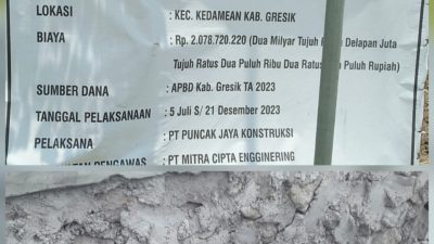 Proyek dengan anggaran Rp. 2.078.720.220 ( Dua milyar tujuh puluh delapan juta tujuh ratus dua puluh ribu dua ratus dua pulub) melalui proses lelang tender DPU kabupaten Gresik dimenangkan PT. PUNCAK JAYA KONSTRUKSI dan konsultan pengawasan PT. MITRA CIPTA ENGGINERING.