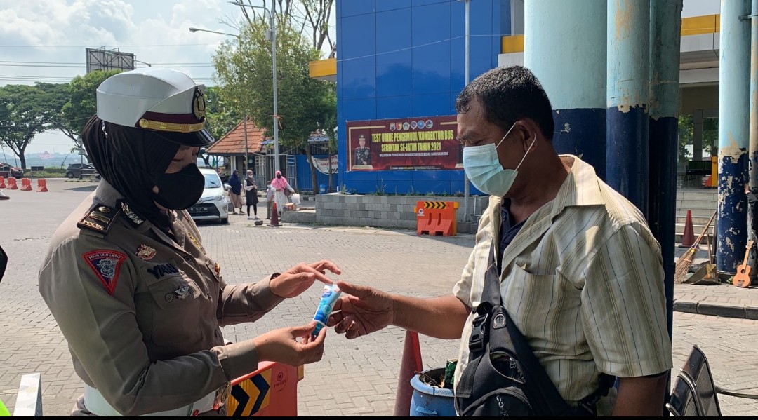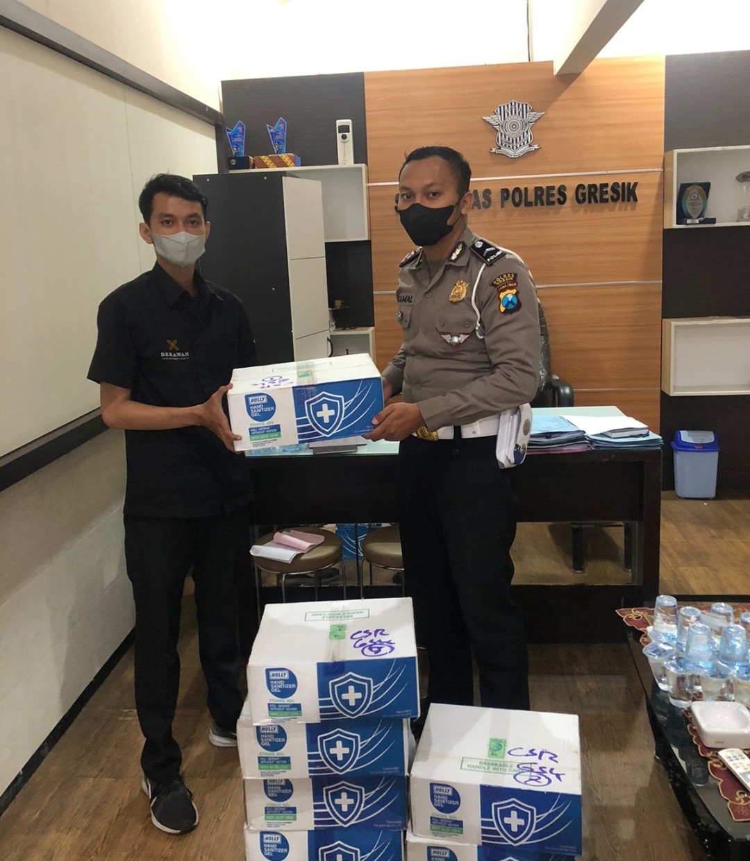 Gresik | RADARJATIM.CO~ Satlantas Polres Gresik menerima bantuan 504 pcs  Handsinitizer dari PT.Sekawan Kosmetik Wasantara untuk dibagikan pada warga Gresik sekitarnya.