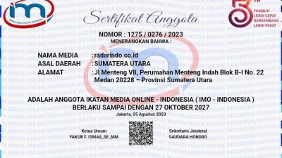 Jakarta || RADARJATIM.CO~Radariindo.co.id Mendapat Sertifikat Anggota dari Ketua Umum Ikatan Media Online (IMO) di Jakarta, melalui wakil Ketua, Safrul Daulay SH, MH, Sabtu (5/8/2023) sore.