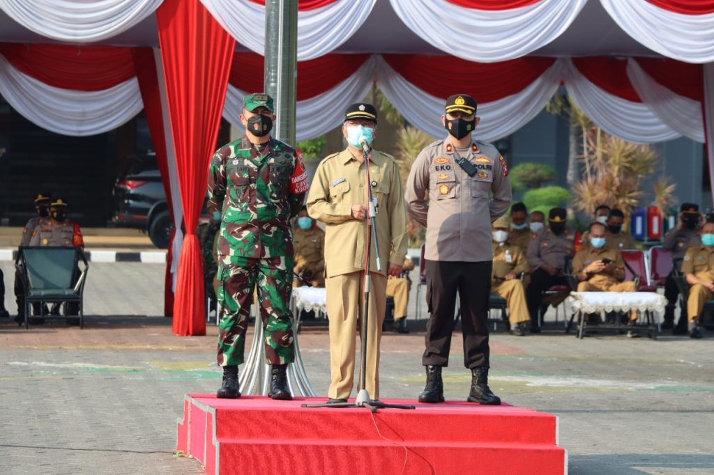 GRESIK [www.radarJatim.co- Guna mengantisipasi perkembangan kenaikan Covid 19 di wilayah Jawa Timur Pemerintah Gresik bersama TNI dan Polri melaksanakan Apel Gelar Pasukan di halaman Pemkab jalan Dr Wahidin Sudiro Husodo Kebomas, Selasa (08/06/2021) .