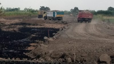 Salah satunya terjadi di Desa Pranti, Kecamatan Menganti, Kabupaten Gresik. Terlihat lalu lalang mobil jenis Dam truk membawa material sertu.