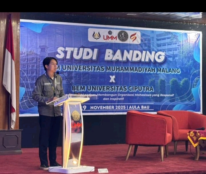 RADARJATIM.CO ~ BEM Universitas Muhammadiyah Malang (UMM) kembali menunjukkan komitmennya dalam pengembangan kapasitas kepemimpinan mahasiswa dengan menjadi tuan rumah agenda studi banding bertema “Empowering Student Leaders: Membangun Organisasi Mahasiswa yang Responsif dan Inspiratif” pada kemarin Kegiatan ini mempertemukan Kegiatan ini mempertemukan Badan Eksekutif Mahasiswa Universitas Muhammadiyah Malang dengan BEM Universitas Ciputra dalam sebuah forum kolaboratif yang bertujuan memperkuat kapasitas kepemimpinan, saling berbagi pengalaman, memperkuat jejaring, meningkatkan responsivitas organisasi, serta menghadirkan inspirasi baru dalam pengelolaan gerakan mahasiswa di masing-masing kampus.