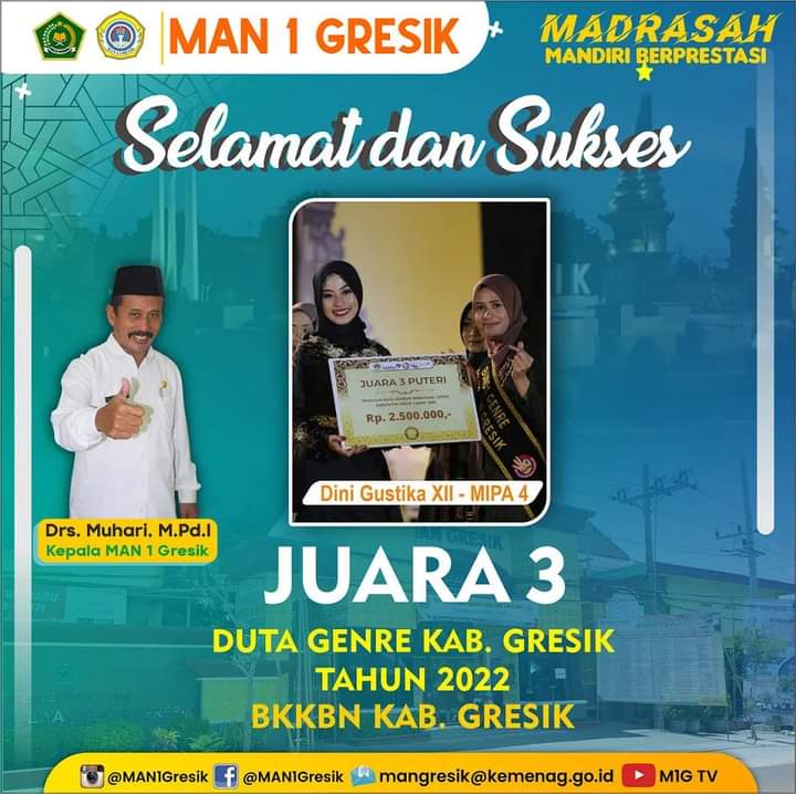 GRESIK, Radarjatim.co – Salah satu siswa MAN 1 Gresik berhasil menorehkan tinta emas dengan prestasi yang ia raih. Siswa tersebut bernama Dini Gustika. Siswa yang saat ini berdomisili di Desa Sukowati, Kecamatan Bungah, Kabupaten Gresik tersebut berhasil menjadi juara 3 Duta Genre (Generasi Berencana) Kabupaten Gresik tahun 2022. Senin (13/11)