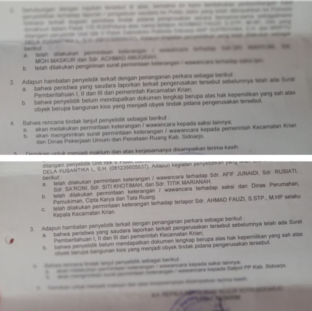 1. Bahwa peristiwa yang saudara laporkan terkait pengerusakan tersebut sebelumnya telah ada surat pemberitahuan I, II dan III dari pemerintah Kecamatan Krian.