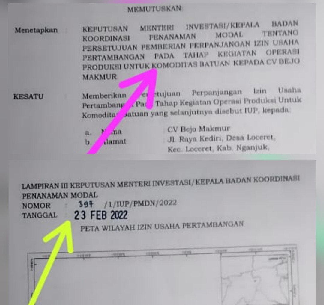 Nganjuk || radarjatim.co~Galian C yang berada di Desa Perning Kecamatan Jati Kalen milik CV Bejo makmur selaku pengelola tambang (galian) untuk keabsahan surat ijin perpanjangan IUPnya bahwasannya ada kejanggalan dalam penulisan surat ijin nya.