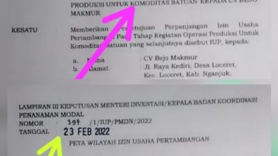 Nganjuk || radarjatim.co~Galian C yang berada di Desa Perning Kecamatan Jati Kalen milik CV Bejo makmur selaku pengelola tambang (galian) untuk keabsahan surat ijin perpanjangan IUPnya bahwasannya ada kejanggalan dalam penulisan surat ijin nya.