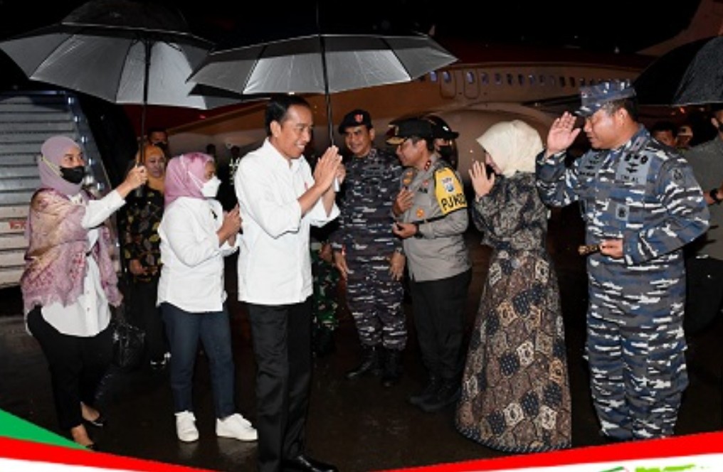 Surabaya || radarjatim.co.– Presiden Joko Widodo dan Ibu Iriana Joko Widodo tiba di Bandara Udara Internasional Juanda, Kabupaten Sidoarjo, Provinsi Jawa Timur, pada Senin sore, 6 Februari 2023, sekitar pukul 19.00 WIB dalam keadaan cuaca hujan