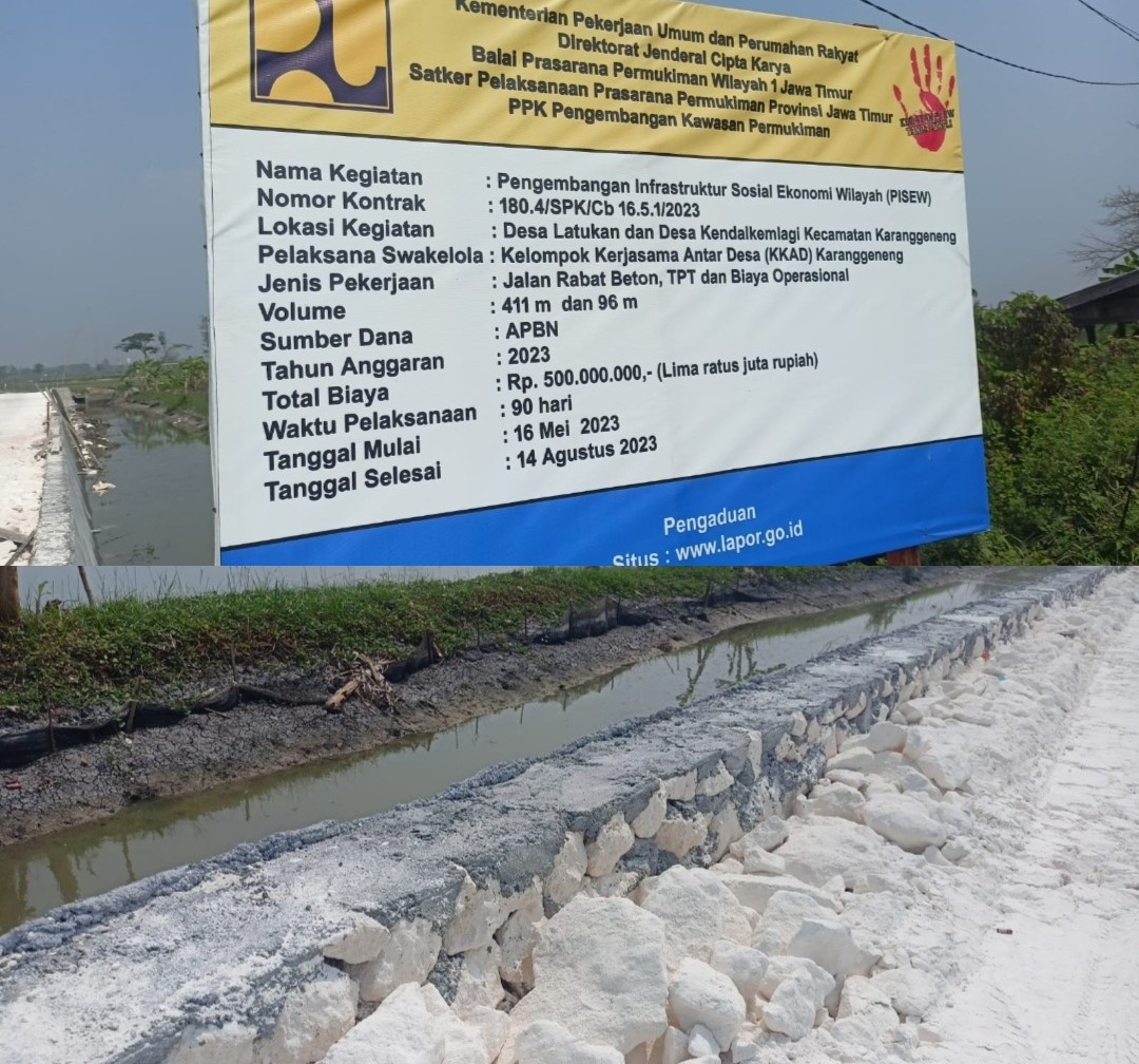 “Ya memang untuk TPTnya memakai batu seperti itu, Anggaran nya 500 juta di bagi 2, Desa Latukan dan Kendalkemlagi, yang di Latukan khusus untuk rabat beton Panjangnya 411 Meter, yang di Desa Kendalkemlagi Volume TPTnya tinggi 2,2 Meter, panjang 96 Meteran tanpa strauss, dan rabat beton panjang 96 Meter.” ujar Damanhuri, Sabtu (24/6)
