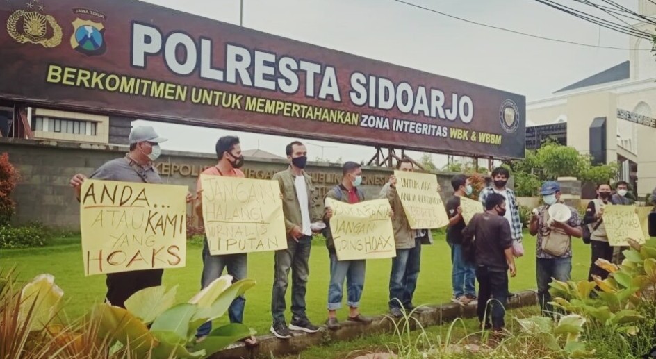 Puluhan jurnalis dari Front Jurnalis Sidoarjo (FJS) menuntut agar oknum polisi yang menuduh berita yang disajikan oleh jurnalis tersebut adalah hoaks dan diduga menghalangi kerja jurnalis, agar segera meminta maaf secara terbuka.