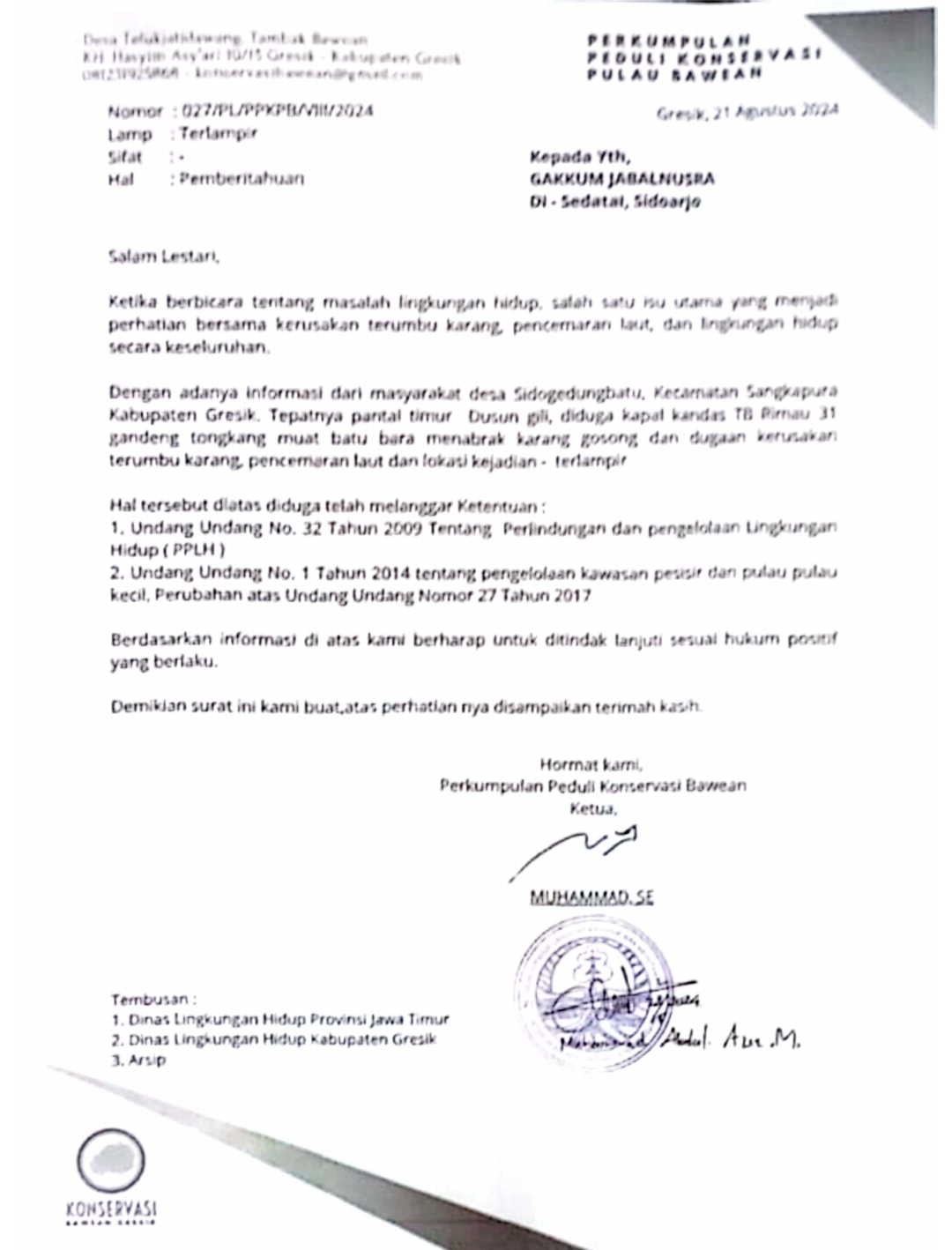 Foto: Surat pengaduan Perkumpulan peduli konservasi Bawean yang ditujukan kepada Yth: GAKKUM JABALNUSRA di Sedati Sidoarjo, (21/8/2024)
