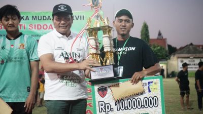 Sidoarjo | RADARJATIM.CO~Turnamen Sepak Bola Perseka Muda Cup XVII berakhir, Minggu kemarin (24/9). Sebulan lebih turnamen itu di gelar Lapangan Desa Kepuh Kiriman Kecamatan Waru. Sore kemarin ditutup Wakil Bupati Sidoarjo H. Subandi SH. Hasil akhirnya club sepakbola dari Ngingas Bersatu menjadi juara 1. Kemudian disusul PS AP juara 2, Ngingas Ambeng-Ambeng juara 3 dan Gagal FC juara 4.